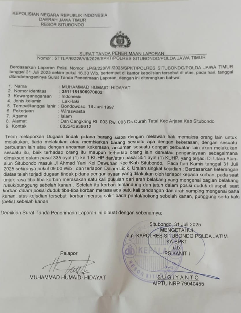 Dalam Laporan Polisi nomor STTLP/B/ 228/VII/ 2025/SPKT/ POLRES SITUBONDO/ POLDA JAWA TIMUR, Muhammad Humaidi Hidayat (korban), diduga menjadi sasaran penganiayaan oleh terlapor yang kini identitasnya dalam penyelidikan saat menyusup ke tengah aksi unjuk rasa itu.
