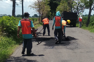Petugas pemeliharaan jalan sedang melakukan aktivitasnya, di jalan ini memang sudah mulai mengalami kerusakan terlihat banyak lubang – lubang yang cukup lebar.