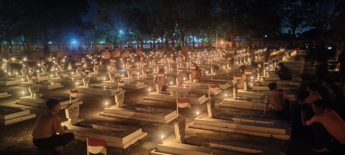 Suasana renungan suci di makam Pahlawan Kusama Negara jalan Kusuma Bangsa Lamongan, disertai nyala ratusan lampu lilin.