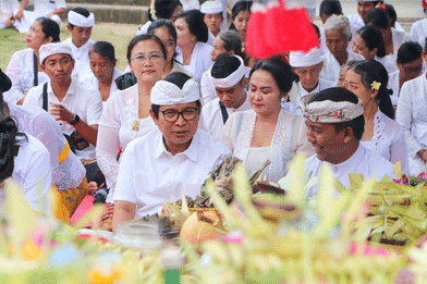 Sekda Badung I Wayan Adi Arnawa menghadiri pujawali dan melaksanakan persembahyangan bersama di Pura Dhang Kahyangan Gunung Payung Desa Adat Kutuh, Kuta Selatan.