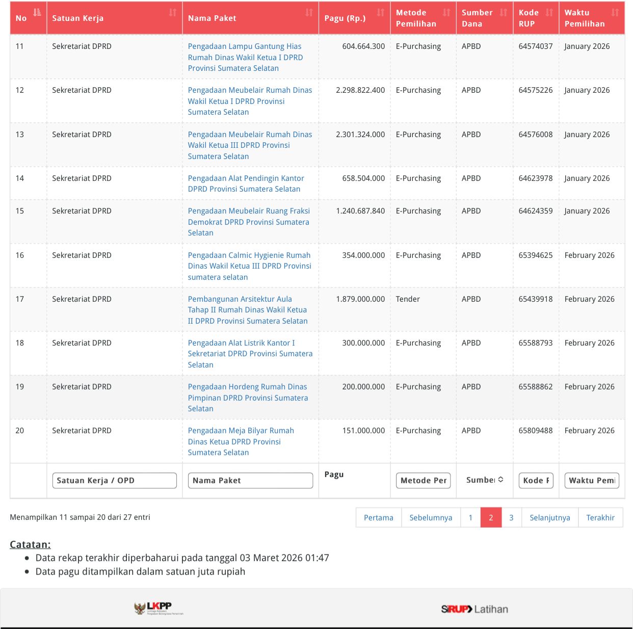 Sebelas paket itu terdiri dari pengadaan gorden rumah dinas Pimpinan DPRD Sumsel senilai Rp200 juta. Lalu, empat paket senilai Rp3,303 miliar untuk rumah dinas Wakil Ketua I meliputi pengadaan meubelair (mabel atau perabotan) Rp2,298 miliar, lampu gantung hias Rp604,664 juta, serta alat olahraga dan audio sound masing-masing Rp200 juta.