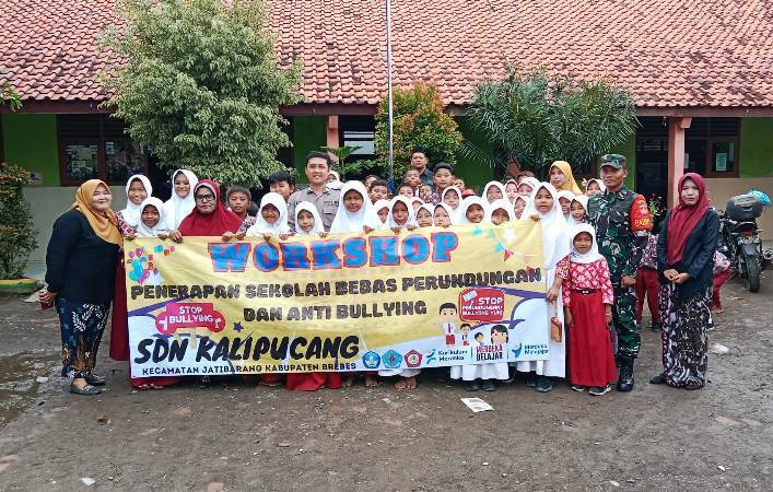 FAKTA – Babinsa Kalipucang Serda Yuni Yanto dan Bhabinkamtibmas Brigadir M. Supriyadi, memberikan penyuluhan tentang perundungan/bullying di lingkungan sekolah SDN Kalipucang, Desa Kalipucang, Kecamatan Jatibarang, Kabupaten Brebes, Jawa Tengah, Rabu (15/11/2023).