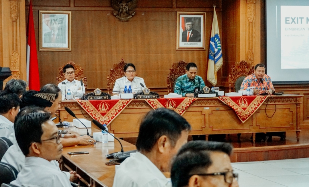 Bupati Nyoman Giri Prasta didampingi Sekda Wayan Adi Arnawa saat menghadiri acara Exit Meeting Bimtek Percontohan Antikorupsi dari Komisi Pemberantasan Korupsi (KPK) RI di Kabupaten Badung, Rabu (3/7/2024).