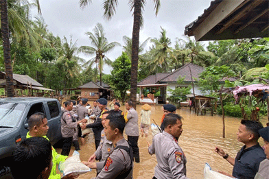 FAKTA – Kapolres Lombok Tengah AKBP Irfan Nurmansyah, bersama anggota turun ke lokasi banjir untuk membantu warga yang terdampak di wilayah Kecamatan Pujut, Jumat (23/12/2022).