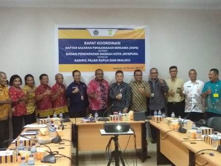 BERTEMPAT di ruang rapat Badan Pendapatan Daerah Kota Jayapura di Jalan Kabupaten APO, dilangsungkan rapat koordinasi daftar sasaran pengawasan bersama (DSPB) Badan Pendapatan Daerah (Bapenda) Kota Jayapura dengan Kanwil Pajak Maluku dan Papua. Dihadiri Kasi PPAD Direktorat Jenderal Pajak Kemenkeu, Samudra Heni Setyawanì, Direktorat PKP DJP, Agus P Hendro, Kanwil DJP Papua Maluku, Irwan Hidayat, Kepala KPP Pratama Jayapura, Nugroho. Sedangkan dari Bapenda diikuti Kepala, Robby Kepas Awi SE MM, beserta Sekretaris dan semua Kepala Bidang dan Kepala Seksi.