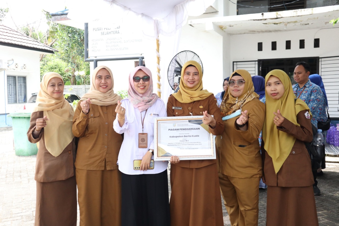 Atas keberhasilan tersebut, Kabupaten Barito Kuala meraih penghargaan Terbaik I dalam Capaian Terbanyak KB MKJP pada Pelayanan KB dan Kesehatan Reproduksi di Pasar Tradisional Tahun 2025 se-Kalimantan Selatan. Penghargaan diserahkan oleh Perwakilan BKKBN Provinsi Kalimantan Selatan, Farah Adibah, S IP,M.SI ke Kabupaten Barito Kuala pada Senin (21/4/2025) di Balai Penyuluhan KB Guntung Manggis, Kota Banjarbaru. (F-913)