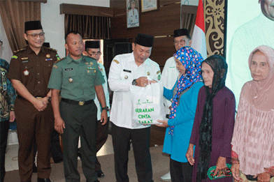 Selanjutnya Pj Bupati Batola Mujiyat menyerahkan bingkisan Gerakan Cinta Zakat yang diikuti Forkopimda. Wakil ketua III Baznas Batola sebut bingkisan yang dibagikan sebanyak 150 senilai Rp200 ribu.