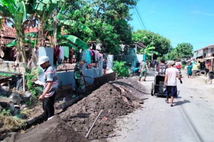 FAKTA – Anggota Koramil 01 Brebes Kodim 0713 Brebes bersama warga Kampung Pancasila Desa Kedunguter, Kecamatan/Kabupaten Brebes, Jawa Tengah, bersih-bersih saluran drainase tersier, Jumat (8/7/2022).