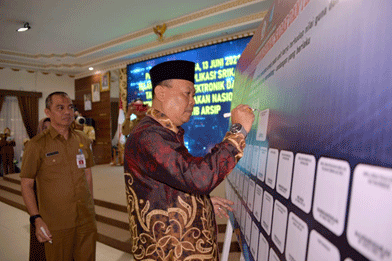 Launching yang ditandai dengan penandatanganan komitmen oleh Pj. Bupati Barito Kuala Mujiyat S.Sn., M.Pd, Sekretaris Daerah Ir. H. Zulkipli Yadi Noor, Analis Kearsipan Provinsi Kalsel Muhammad, SH., Kepala SKPD dan Camat se-Kabupaten Barito Kuala.