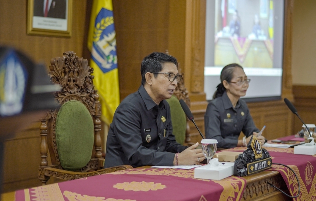 Bupati Wayan Adi Arnawa mengikuti secara daring Rapat Koordinasi Program Pemberantasan Tindak Pidana Korupsi Tahun 2025, yang dilaksanakan oleh KPK RI, di Ruang Rapat Kriya Gosana, Puspem Badung, Rabu (30/4/2025).
