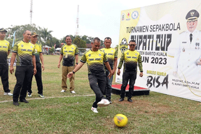 FAKTA – Sekretaris Daerah (Sekda) Kabupaten Barito Kuala (Batola) Ir. H. Zulkipli Yadi Noor, M.Sc. mewakili Pj. Bupati Mujiyat, membuka secara resmi turnamen sepak bola Bupati Cup ke-IX di lapangan 5 Desember (23/08/2023).