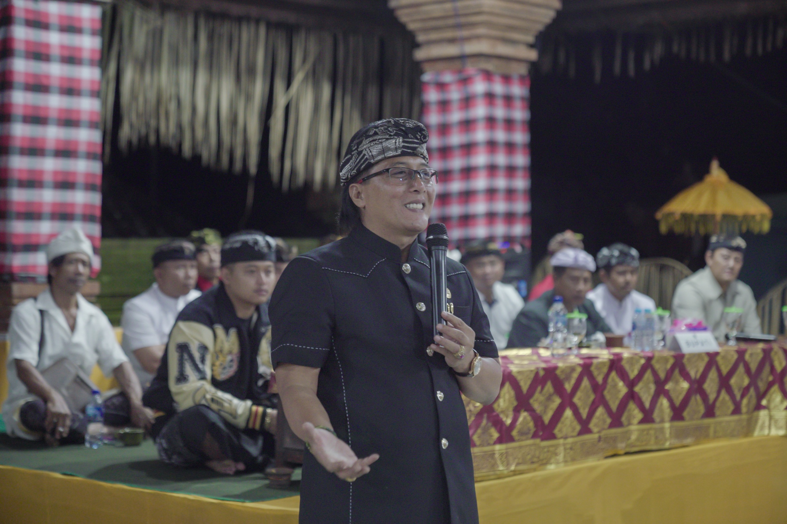 Bupati Nyoman Giri Prasta menghadiri karya di Desa Adat Sandakan, Desa Sulangai, Kecamatan Petang, bertepatan dengan rahinan Tilem Kapitu, wuku Kulantir, Rabu (10/1/2024).