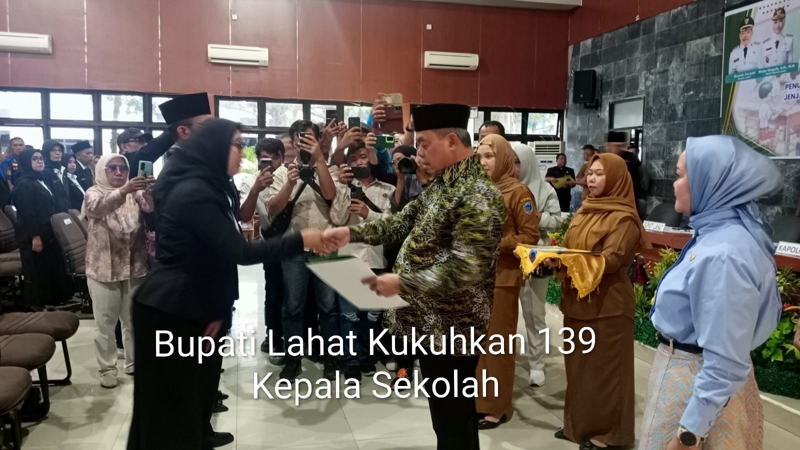 Bupati Lahat, Bursah Zarnubi, S.E., secara resmi menyerahkan Surat Keputusan (SK) penugasan kepada 140 pejabat baru di lingkungan Pemerintah Kabupaten Lahat. Sebanyak 139 mandat diberikan kepada para pendidik yang kini dipercaya menjabat sebagai Kepala Sekolah mulai dari jenjang TK, SD, hingga SMP, ditambah satu mandat khusus bagi Camat Sukamerindu.