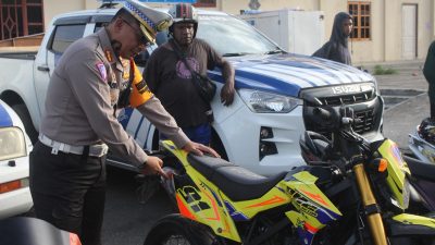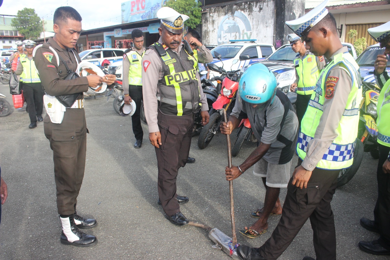 FAKTA – Direktorat Lalu Lintas Polda Papua melakukan razia gabungan yang bekerja sama dengan TNI, Jasa Raharja dan Bapenda bertempat di halaman Papua Trade Center (PTC) Entrop Jayapura Selatan, Rabu (17/01/2024).