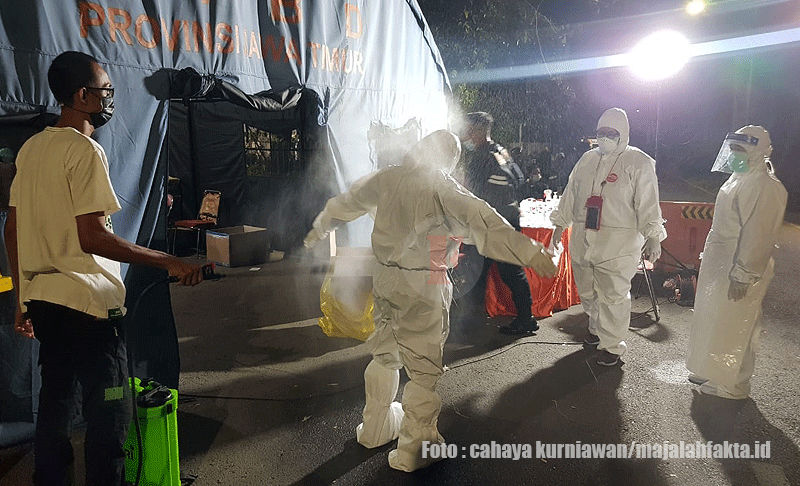 Majalahfakta.id – Sudah menjadi kewajiban buat para dokter dan tenaga kesahatan mengenakan hazmat sebelum menangani pasien Covid-19. Tidak terkecuali buat mereka yang bertugas di garis depan pos test swab massal Jembatan Suramadu.