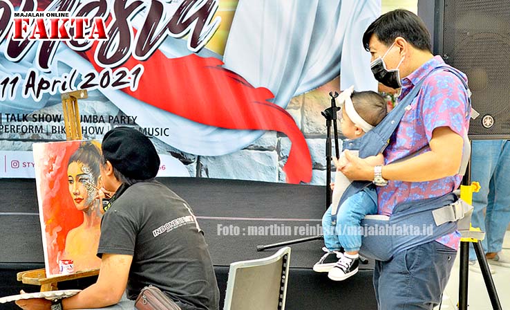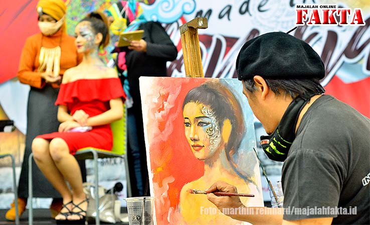 Sejumlah pelukis Sidoarjo dari berbagai aliran beraksi di sebuah pusat perbelanjaan Jalan Raya Jati, Sidoarjo, Jumat (09/4/2021) dalam rangkaian kegiatan pameran Usaha Mikro Kecil dan Menengah (UMKM) bertajuk Made in Indonesia. Mereka melukis sebuah model berbodi painting yang disediakan panitia. Selanjutnya, lukisan tersebut di pamerkan ke pengunjung pusat perbelanjaan tersebut. (Foto dan naskah : Marthin Reinhard/majalahfakta.id)