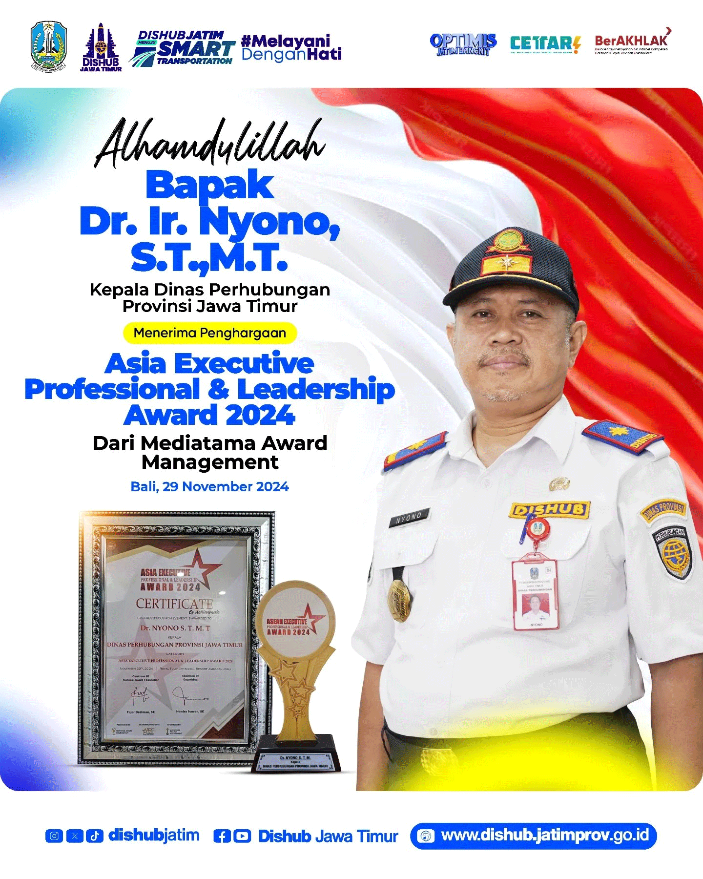 Kali ini, Kepala Dishub Provinsi Jatim menerima penghargaan Asia Executive Professional dan Leadership Award 2024 dari Mediatama Award Management pada 29 November 2024 di Bali.