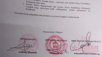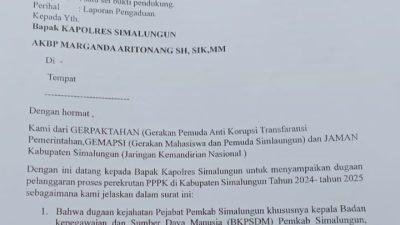 Tiga Lembaga terdiri dari Gerakan Anti Korupsi Transparan si Pemerintahan Ketua Hotlan Purba Gerakan Mahasiswa Pemuda Simalungun (Gemapsi) Ketua Anthony Damanik, dan Lembaga Jaman (Jaringan Kemandirian Nasional) diketuai Johannes Sembiring pada Senin (28/4/2025) telah melaporkan Kadis BKSDM Simalungun Provinsi Sumatera Utara J. Saragih ke Polres Simalungun Provinsi Sumatera Utara terkait dugaan perekrutan calon PPPK Kab Simalungun Provinsi Sumatera Utara.