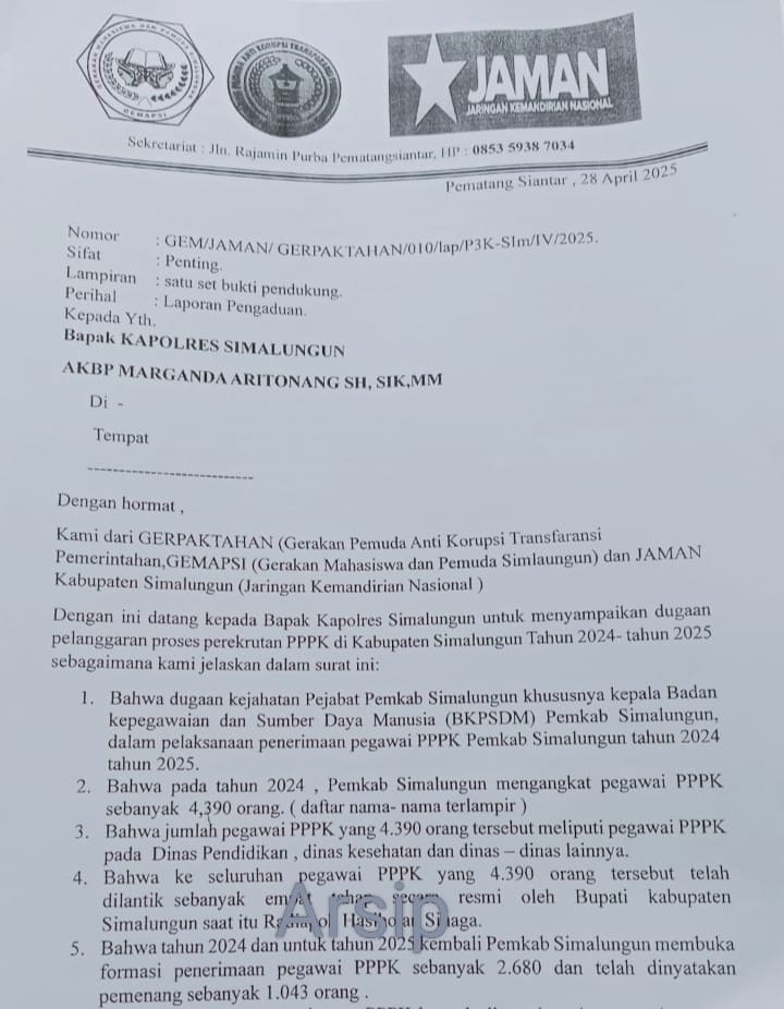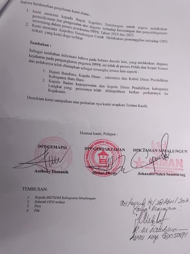 Tiga Lembaga terdiri dari Gerakan Anti Korupsi Transparan si Pemerintahan Ketua Hotlan Purba Gerakan Mahasiswa Pemuda Simalungun (Gemapsi) Ketua Anthony Damanik, dan Lembaga Jaman (Jaringan Kemandirian Nasional) diketuai Johannes Sembiring pada Senin (28/4/2025) telah melaporkan Kadis BKSDM Simalungun Provinsi Sumatera Utara J. Saragih ke Polres Simalungun Provinsi Sumatera Utara terkait dugaan perekrutan calon PPPK Kab Simalungun Provinsi Sumatera Utara.