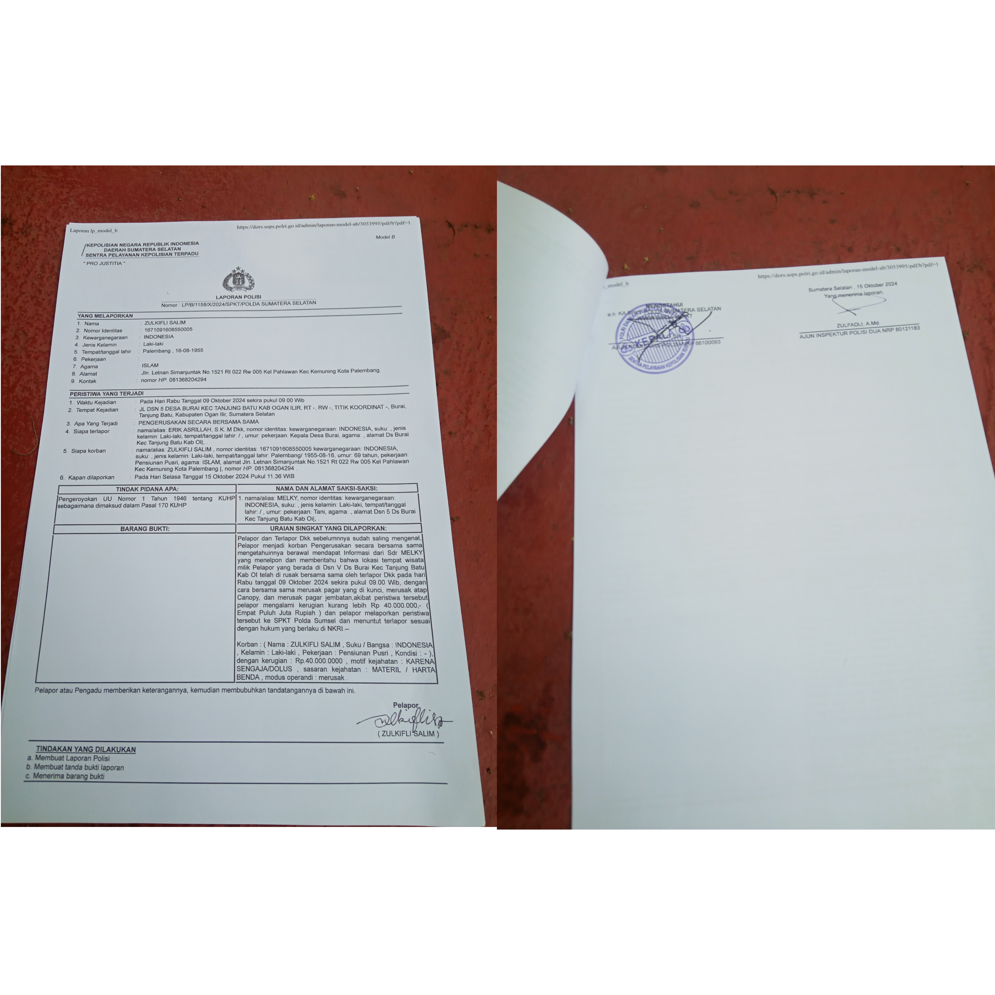 Zulkifli Salim mengatakan pada hari Rabu (9/10/2024), sekira pukul 09.00 WIB di Jalan Dusun 5 Desa Burai Kecamatan Tanjung Batu OI telah terjadi pengerusakan secara bersama-sama yang diduga dilakukan oleh Erik dan kawan-kawan, merusak pagar, kunci gembok, jembatan dan seng kanopi, yang mengakibatkan Ia mengalami kerugian, moril maupun materil, untuk itulah kami melaporkan perbuatan kades tersebut, kepada Kapolda untuk menjaga nama baik keluarga, itu tanah kami memiliki surat lengkap,sejak tahun 1962. Tidak ada masalah dengan siapapun, dan itu tanah kami, mau kami pagar, mau kami jual itu hak kami, kenapa ada orang yang tidak senang,” keluh Zukarnain di dampingi penasihat hukumnya, Muhammad Yamin, S.H., namun M Yamin, enggan berkomentar, “Kita tunggu saja tanggal mainnya,” ujarnya.