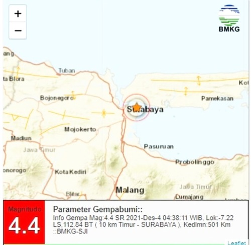 Majalahfakta.id – Berdasarkan keterangan BMKG, gempa berkekuatan M 4,4 mengguncang Surabaya Jawa Timur pada pukul 04:38:11 WIB, Sabtu (4/12/2021). Pusat gempa berada di 10 KM Timur Surabaya.