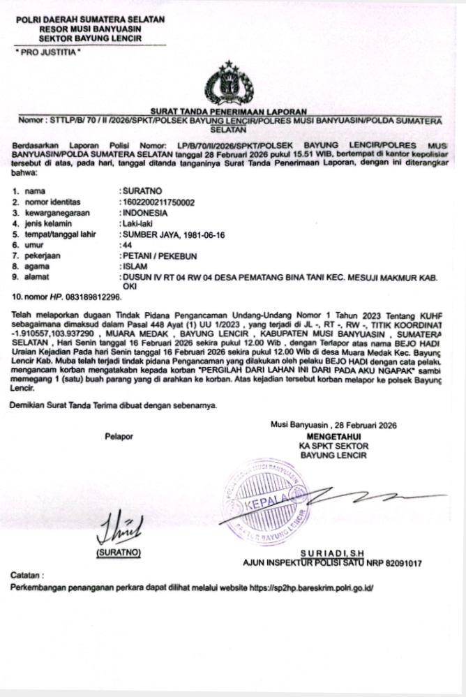 Seorang warga bernama Suratno resmi melaporkan dua orang terduga pelaku, Bejo Hadi dan anaknya, Slim, ke pihak Kepolisian Sektor Bayung Lincir pada Sabtu, 28 Februari 2026.