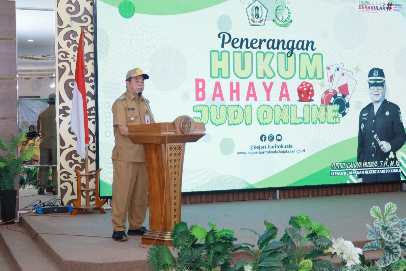 Sosialisasi penerangan hukum bahaya judi online diisi oleh Kepala Kejaksaan Negeri Barito Kuala Yussie Cahaya Hudaya, S.H., M.Kn, Kepala Dinas Kominfo Hery Sasmita, S.STP., M.AP, dan Kepala Inspektorat Selamat Riyanto, S.STP., M.Ec. Dev. Kegiatan tersebut dihadiri beserta para Staf Ahli Bupati, Asisten Sekda, pimpinan SKPD dan Camat se-Kabupaten Barito Kuala. (F-913)