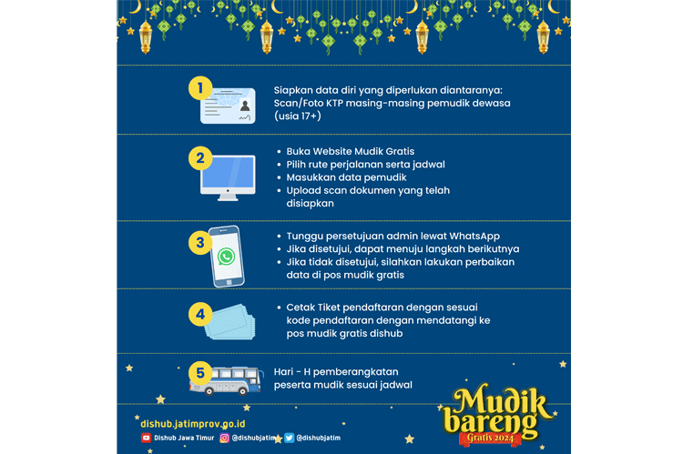 Dikutip dari laman resmi Dinas Perhubungan Jawa Timur, Informasi Pendaftaran Mudik Online dimulai tanggal 13 Maret 2024 – 20 Maret 2024.