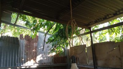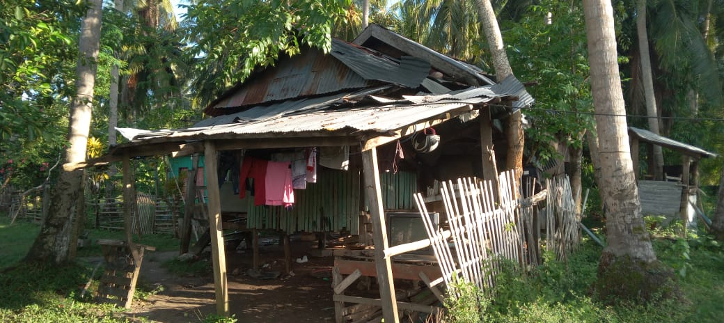Ketiganya tinggal menempati bangunan rumah yang atapnya sudah hancur dan bolong akibat tertimpa buah serta daun kelapa disaat angin kencang datang menyapa.
