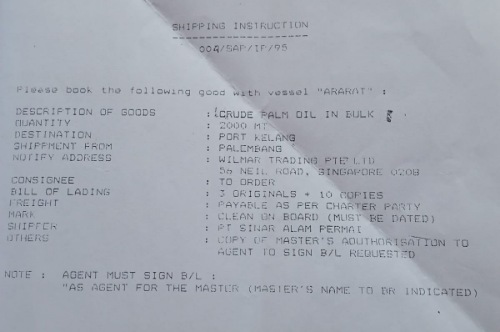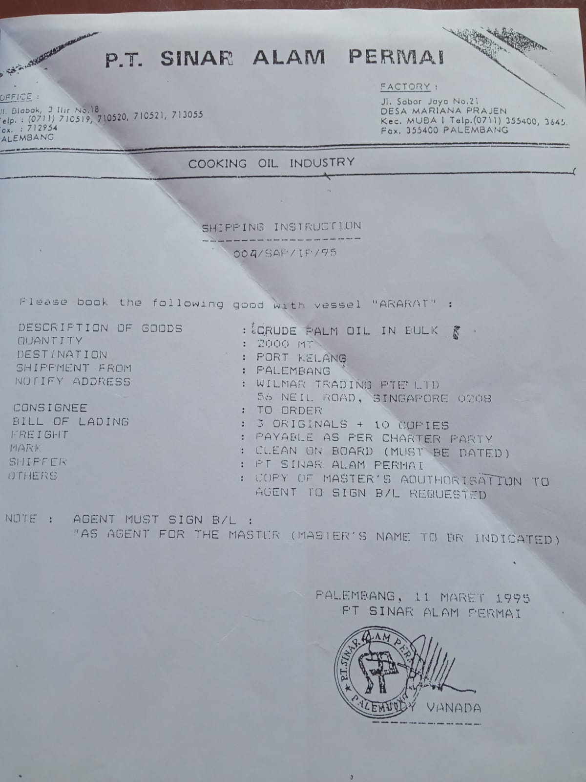 FAKTA – Sebuah dugaan manipulasi dokumen ekspor minyak sawit mentah (Crude Palm Oil/CPO) pada medio Maret 1995 menyeret nama PT Sinar Alam Permai (SAP). General Manager PT SAP, Fandi Fanda, diketahui menandatangani dokumen ekspor CPO sebanyak 2.000 metrik ton (MT) sesuai Shipping Instruction tertanggal 11 Maret 1995 dengan nomor 004/SAP/IP/1995.