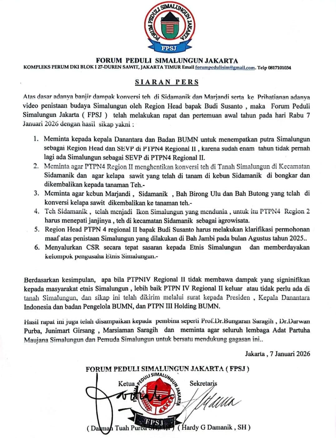 Dalam keterangan pers resmi yang ditandatangani oleh Ketua FPSJ, Darman Tua Purba S.Sos, dan Sekretaris Hardy G. Damanik SH, organisasi ini melayangkan tuntutan keras agar Budi Santoso segera menyampaikan permohonan maaf secara terbuka kepada seluruh masyarakat Simalungun atas tindakan yang dinilai telah merusak martabat kebudayaan setempat.