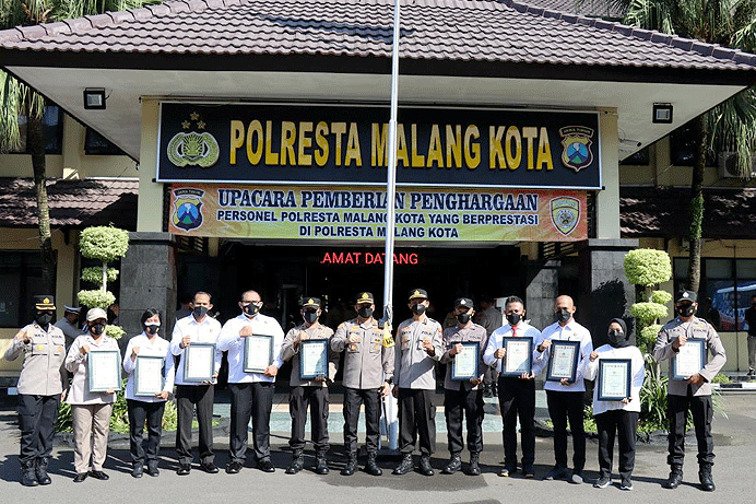 Kombes Pol Budi Hermanto memberikan penghargaan kepada sejumlah personel Polresta Malang Kota yang berprestasi.