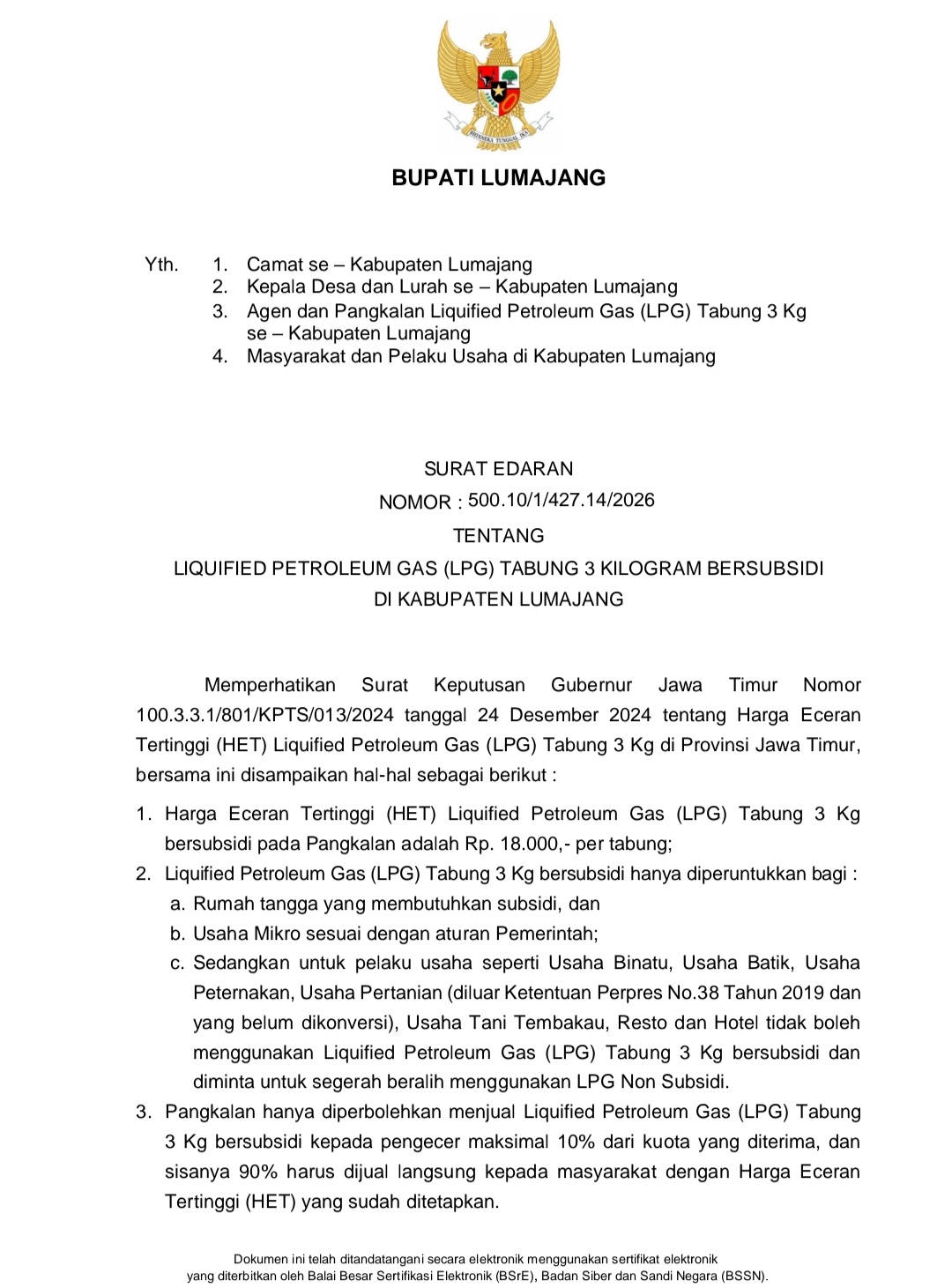 Kelangkaan Gas Melon Jadi Sorotan. Surat Edaran ini muncul di tengah meningkatnya keluhan masyarakat terkait kelangkaan dan mahalnya harga LPG 3 kilogram di Lumajang.