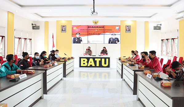 Polres Batu – Kapolres Batu, AKBP I Nyoman Yogi Hermawan didampingi para pejabat utama Polres Batu melaksanakan dialog dan silaturahmi dengan Mahasiswa dari berbagai Universitas yang bertajuk ‘Diagram’ (Dialog Bersama Mahasiswa) Jumat (18/2/2022)