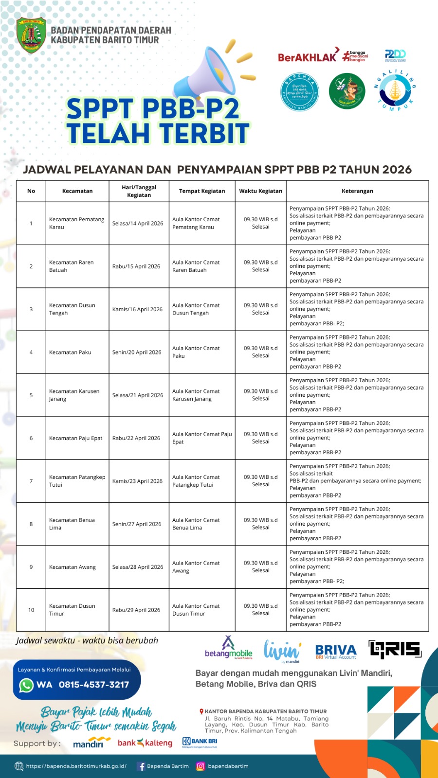 FAKTA – Pemerintah Kabupaten Barito Timur melalui Badan Pendapatan Daerah (Bapenda) kembali menunjukkan komitmennya dalam meningkatkan pelayanan publik. Selasa (14/4/2026), kegiatan sosialisasi sekaligus pelayanan pembayaran Pajak Bumi dan Bangunan Perdesaan dan Perkotaan (PBB-P2) resmi dimulai di Kecamatan Pematang Karau.