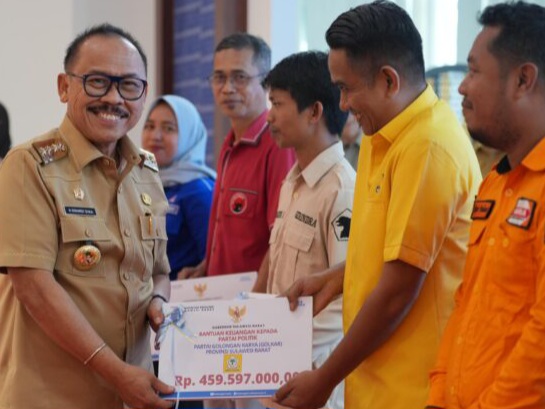 FAKTA – Gubernur Sulawesi Barat, Suhardi Duka menyerahkan bantuan hibah kepada Partai Politik yang memiliki kursi legislatif, Senin 28 April 2025.