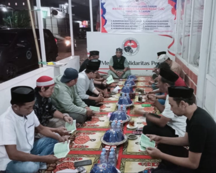 Acara dilakukan sederhana, dengan menggelar karpet di teras Sekretariat Ikatan Jurnalis Sulbar dan duduk bersila. Bersamaan deru klanpot kendaraan yang melintas, suasana hitmad terlihat. Mereka, para jurnalis dari berbagai media di Mamuju itu tampak khusyuk.