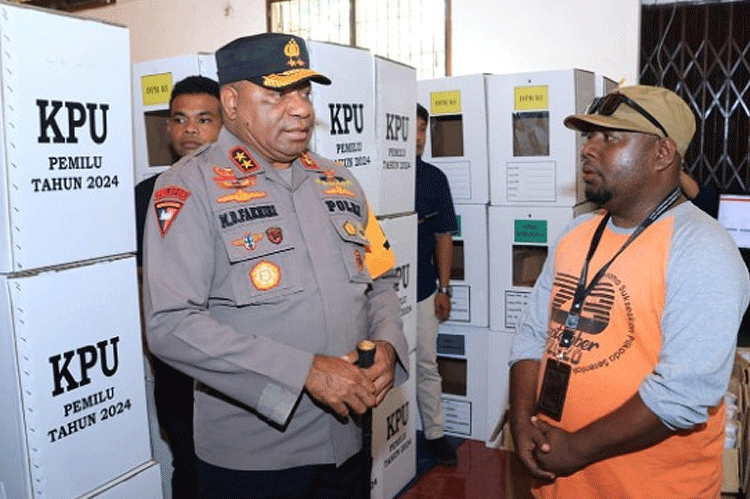 FAKTA – Memastikan keamanan dan kelancaran distribusi logistik Pemilu menjelang hari pencoblosan pada 14 Februari 2024, Kapolda Papua Irjen Pol Mathius D. Fakhiri beserta jajaran pimpinan Polda Papua, memeriksa kesiapan logistik Pemilihan Umum (Pemilu) Tahun 2024 di Gudang Logistik Pemilu di Kabupaten Jayapura dan Kota Jayapura pada Selasa (30/1/2024).