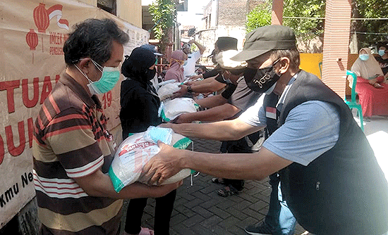 Bhakti sosial Arek Jogoboyo membagikan paket sembako sebanyak 100 karung dalam kemasan beras 10 kg bagi warga yang membutuhkan di masa pandemi. Selain beras juga dibagikan masker dan hands sanitizer.
