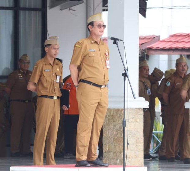 FAKTA – Kepala Dinas Pekerjaan Umum dan Penataan Ruang (PUPR) Kabupaten Barito Kuala (Batola), Akhdiyat Sabari, bertindak sebagai Pembina Upacara di halaman Kantor Sekretariat Daerah Kabupaten Barito Kuala pada Senin (13/04).