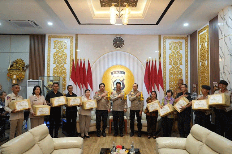 FAKTA – Menjelang hari Natal, Kepala Kepolisian Daerah Bali, Irjen Pol Ida Bagus Kd Putra Narendra didamping PJU Polda Bali menyerahkan Tali asih berupa bingkisan natal untuk personil Polda Bali yang beragama Kristen di Lounge Sura Dwipa Sarvabhavena, Jumat (22/12/2023).