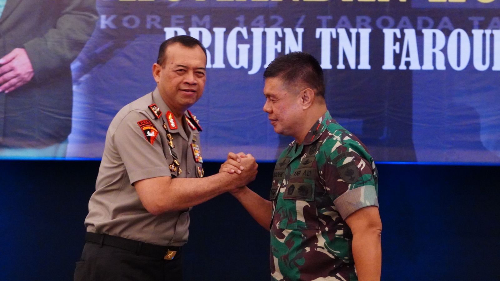 Dikesempatan yang sama, selain mengucapkan selamat kepada Brigjen TNI Farouk Pakar, Kapolda juga memberikan cenderamata sebagai tanda keakraban dan Sinergitas yang kuat.