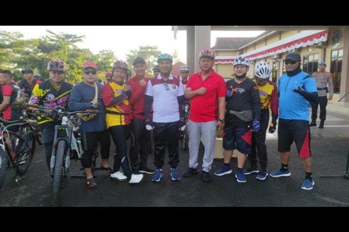 Memperingati hari Bhayangkara ke 76, Polres Pesawaran, Lampung gelar gowes bersama.