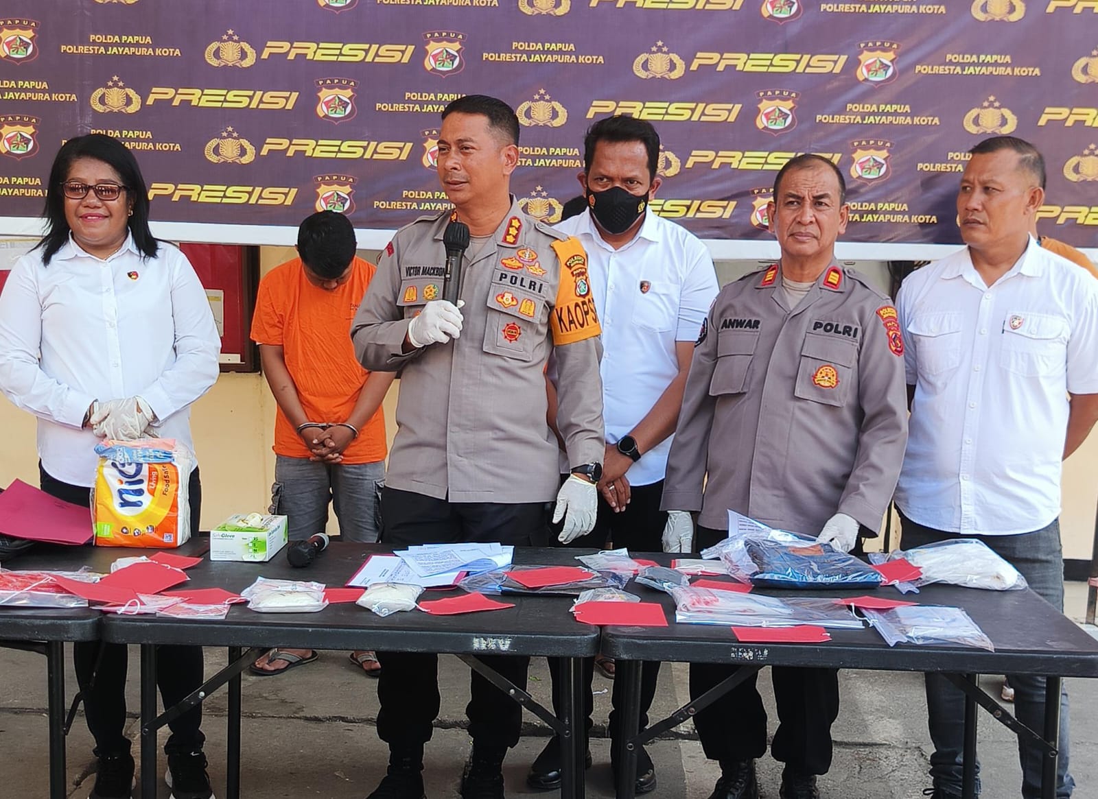 FAKTA – Sabu sebanyak setengah kilogram yang berhasil diungkap Satuan Narkoba Polresta Jayapura Kota memiliki sistem terputus dan terkontrol dari luar atau dari Makassar. Hal itu dikatakan Kapolresta Jayapura Kota Kombes Pol Dr. Victor D. Mackbon, S.H., S.IK., M.H., M.Si saat menggelar Press Conference kepada awak media bertempat di Mapolresta, Senin (8/7/2024) pagi.