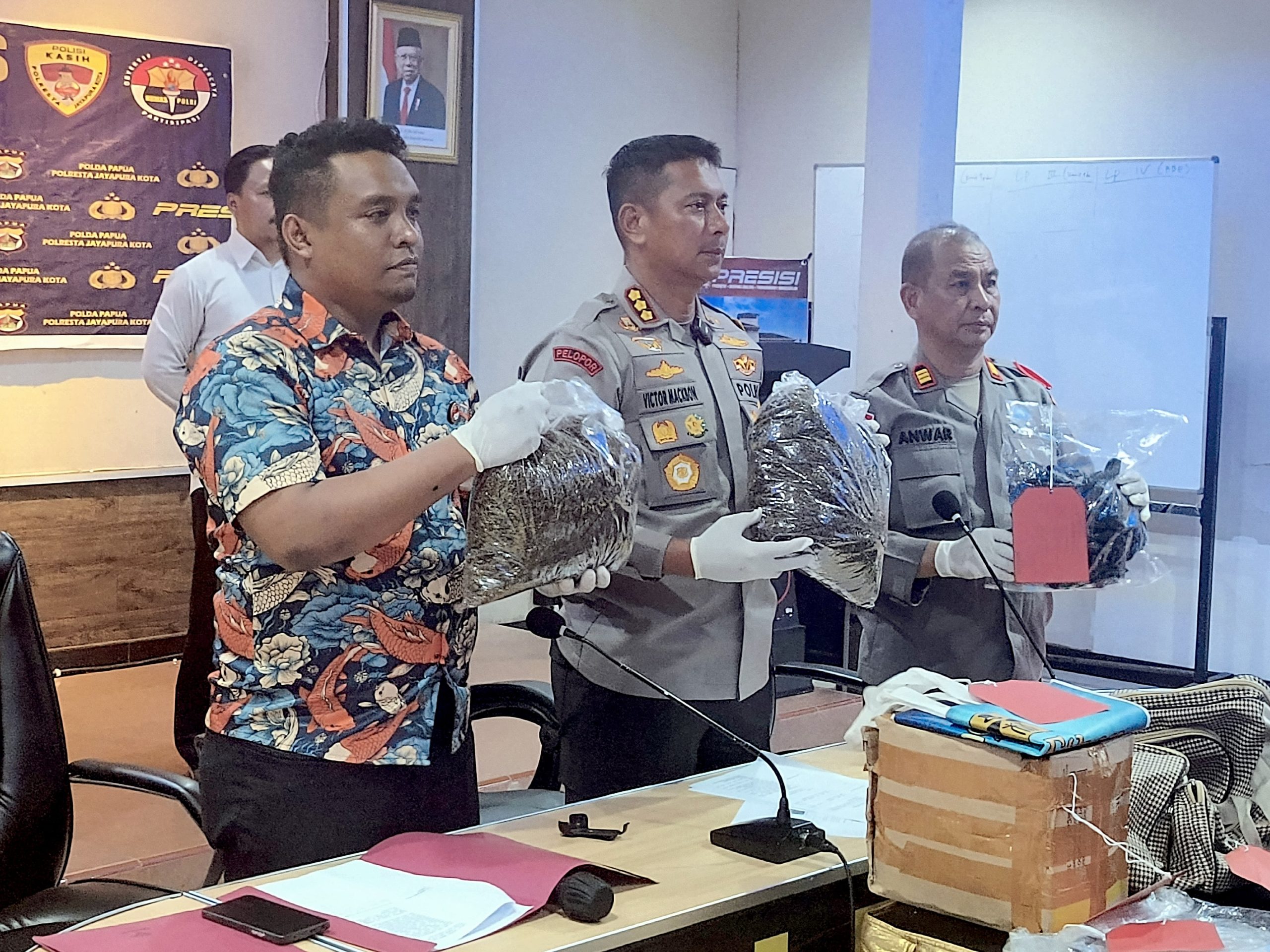 FAKTA – Satuan Narkoba Polresta Jayapura Kota kembali berhasil gagalkan pengiriman narkoba jenis Ganja di area Pelabuhan Laut Jayapura, sebanyak 2,5 Kg Ganja diamanatkan beserta pemiliknya seorang pria berinisial AJ (38) dan kini dalam proses penyidikan.