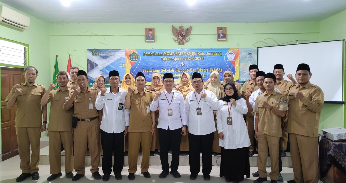 FAKTA – Kepala kantor Kementerian Agama (Kakemenag) Kabupaten Jombang, Muhajir, me-launching sekolah percontohan ekstra Tahfidz di 11 sekolah (SMPN) di Kabupaten Jombang, Jawa Timur launching dilaksanakan bersamaan dengan pembukaan Musyawarah Guru Mata Pelajaran (MGMP) Pendidikan Agama Islam dan Budi Pekerti (PABP) tahun 2024-2025, Senin ( 26/8/2024).