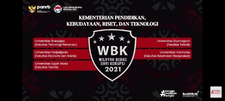 Sementara dari perguruan tinggi lima unit kerja yang ditetapkan WBK yaitu Fakultas Teknologi Pertanian Universitas Brawijaya, Fakultas Ekonomi dan Bisnis Universitas Padjadjaran, Fakultas Teknik Universitas Gadjah Mada, Fakultas Teknik Universitas Diponegoro, dan Fakultas Kesehatan Masyarakat Universitas Indonesia. (mud/hms)