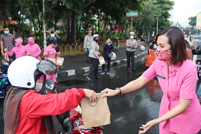 “Dengan adanya kegiatan bagi-bagi takjil seperti ini, setidaknya kita bisa membantu masyarakat yang masih beraktifitas untuk sekedar berbuka puasa,” papar Ny. Ayu Yogi.