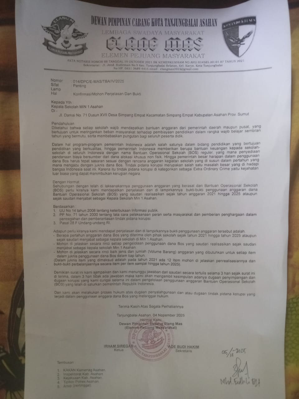 Ketua DPC LSM Elang Mas Kota Tanjung Balai Ilham Siregar 7/11 menjawab pertanyaan awak media tentang dugaan pengutipan tersebut, pihak LSM Elang Mas Kota Tanjung Balai telah turun langsung untuk investasi dan data akurat. “Telah kami dapatkan termasuk rekaman dari staf MIN l Asahan membenarkan bahwa kepala sekolah mengerjakan sendiri tanpa bendahara dan pengurus lainnya jika ada bantuan untuk sekolah termasuk dana Bos,” ujar Ketua DPC LSM Elang Mas Kota Tanjung Balai merinci semua data akurat tentang Kepala Sekolah itu.
