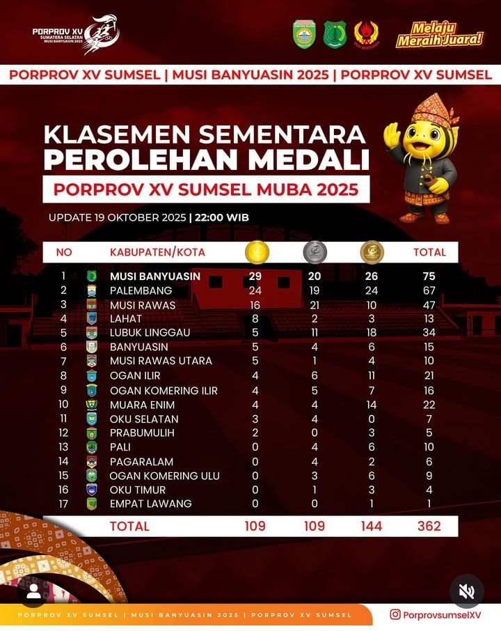 FAKTA – Kontingen Kabupaten Lahat perolehan sementara untuk medali emas 8, medali perak 2, medali perunggu 3 total 13, Kabupaten Lahat untuk sementara diperingkat ke 4.